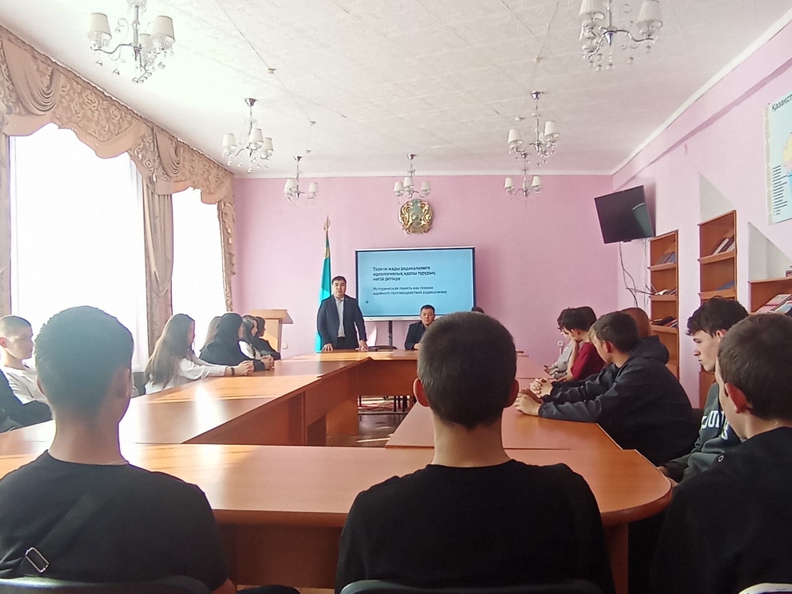 2025 жылдың 17 сәуірінде "Қарасу ауыл шаруашылығы колледжі" КМҚК тарих пәнінің оқытушысы Д.К. Сейдахметова ТМ-26/1 тобының білім алушыларымен "жастарды түрлі ұйымдарға тарту"тақырыбында дәріс өткізді. Іс-шара соңында білім алушыларға бейнефильм көрсетілді.