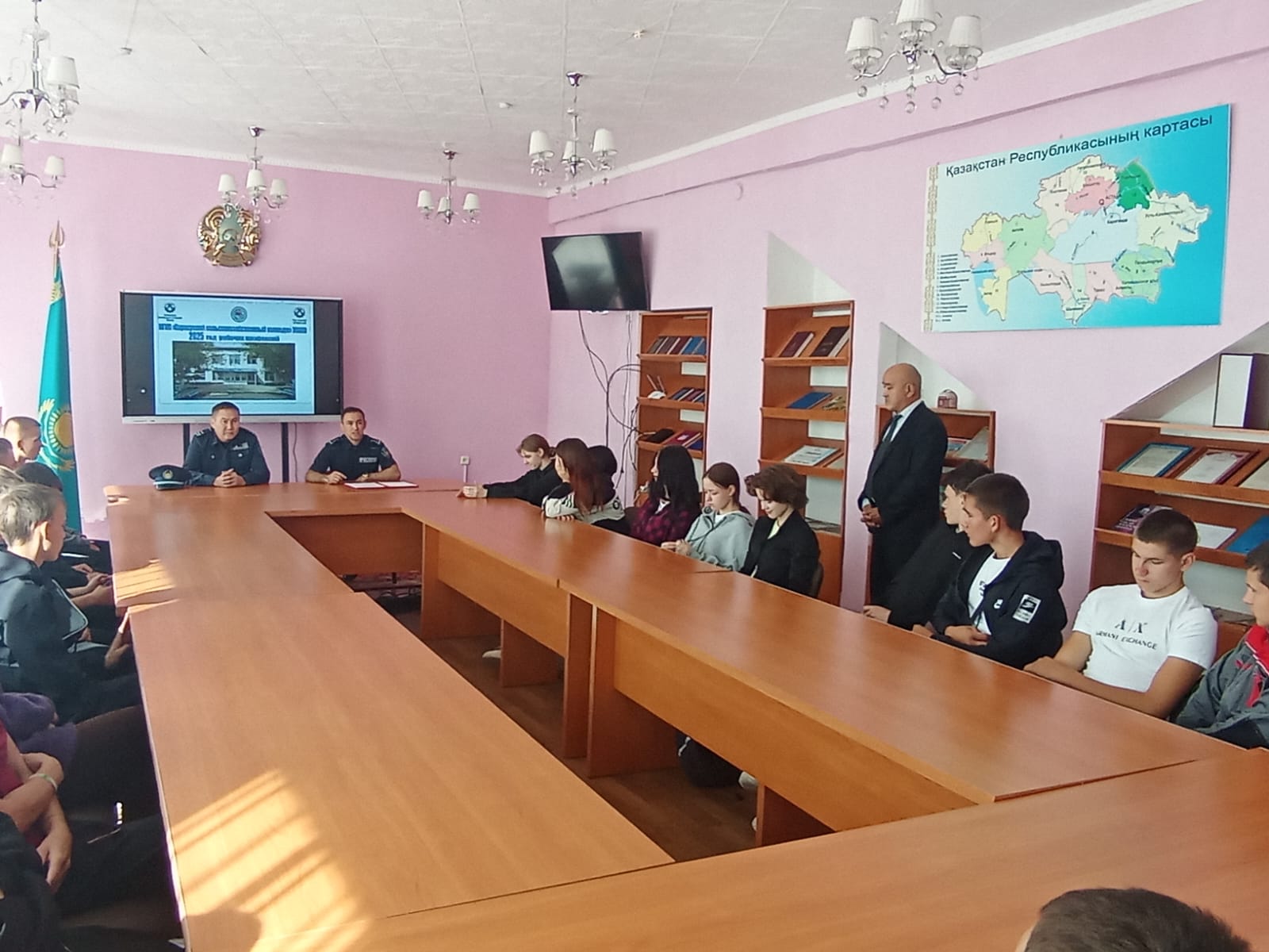 Әңгімелесу барысында білім алушыларға құқықтық жауапкершіліктің маңызды тұстары, құқық бұзушылық пен қылмыс жасағаны үшін жазалау шаралары туралы түсіндірілді.