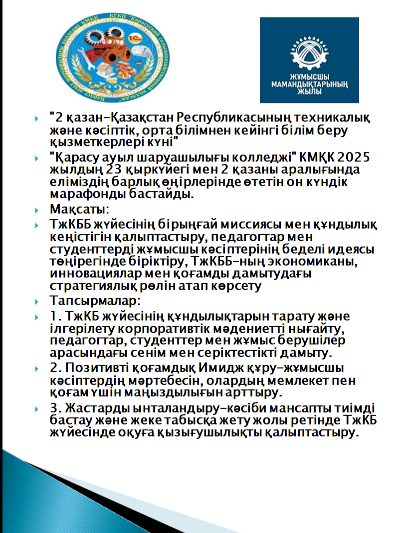 2025 жылғы 16 мамырда гор. Қостанайда" Қарасу ауыл шаруашылығы колледжі "КМҚК білім алушылары"Студенттік көктем-2025" фестиваліне қатысты.